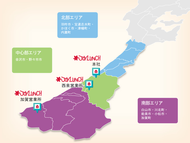 金沢市を中心に南は加賀市から北は羽咋市までお届けしています。 石川県中心部 金沢市・野々市市 石川県南部 白山市・小松市・加賀市・能美市・川北町 石川県北部 かほく市・羽咋市・津幡町・内灘町 ※上記のエリアでもお届けが難しい場合がございます。詳しくはお問い合わせからお願い致します。