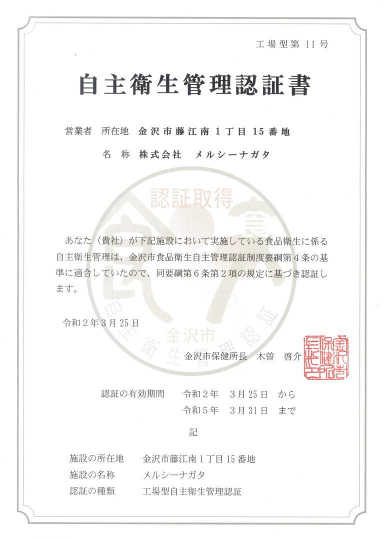 ジョイランチでは、お弁当やお食事を安心して食べていただけるよう、HACCP基準に沿った運営を行い、毎日のお食事に安全性を高めれるような取り組みの実践が認められ、ジョイランチ製造工場が金沢市保健所より自主衛生管理認証書を所得いたしました。